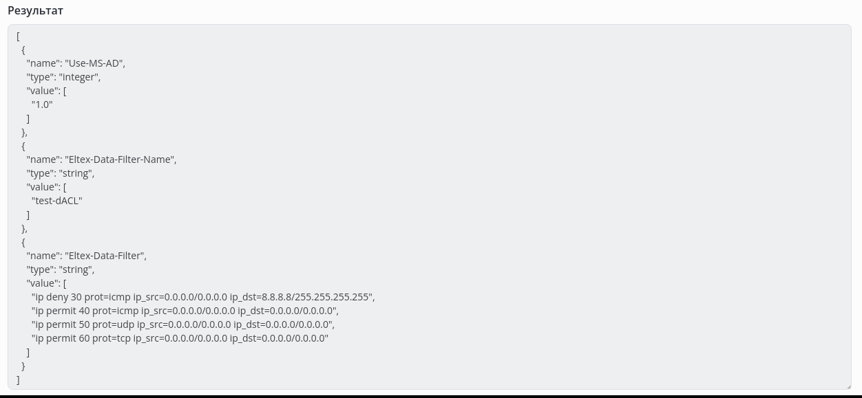 Eltex:Eltex-Data-Filter-Name - указывает имя dACL Eltex:Eltex-Data-Filter - указывает правило для dACL (может использоваться несколько раз)