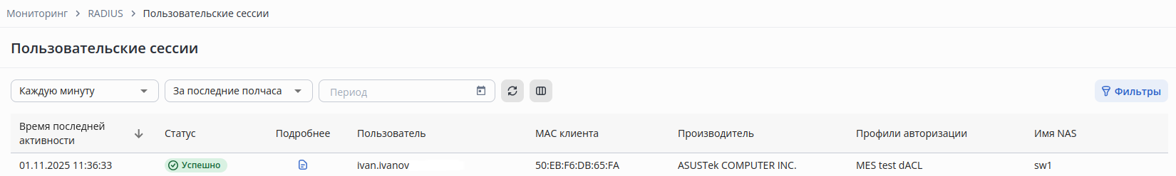 После настройки клиентского подключения и попытки авторизации результат авторизации можно будет увидеть в разделе Мониторинг → RADIUS → Пользовательские сессии.