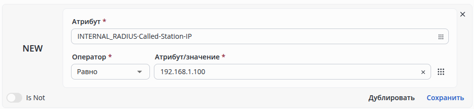 | IP-адрес | 192.168.1.100 | INTERNAL_RADIUS·Called-Station-IP = 192.168.1.100INTERNAL_RADIUS·Called-Station-String = 192.168.1.100 |