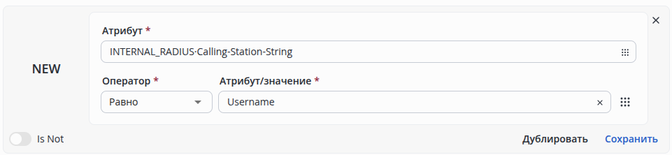 | Текст/спецформат | Username1 | INTERNAL_RADIUS·Calling-Station-String = Username1 |