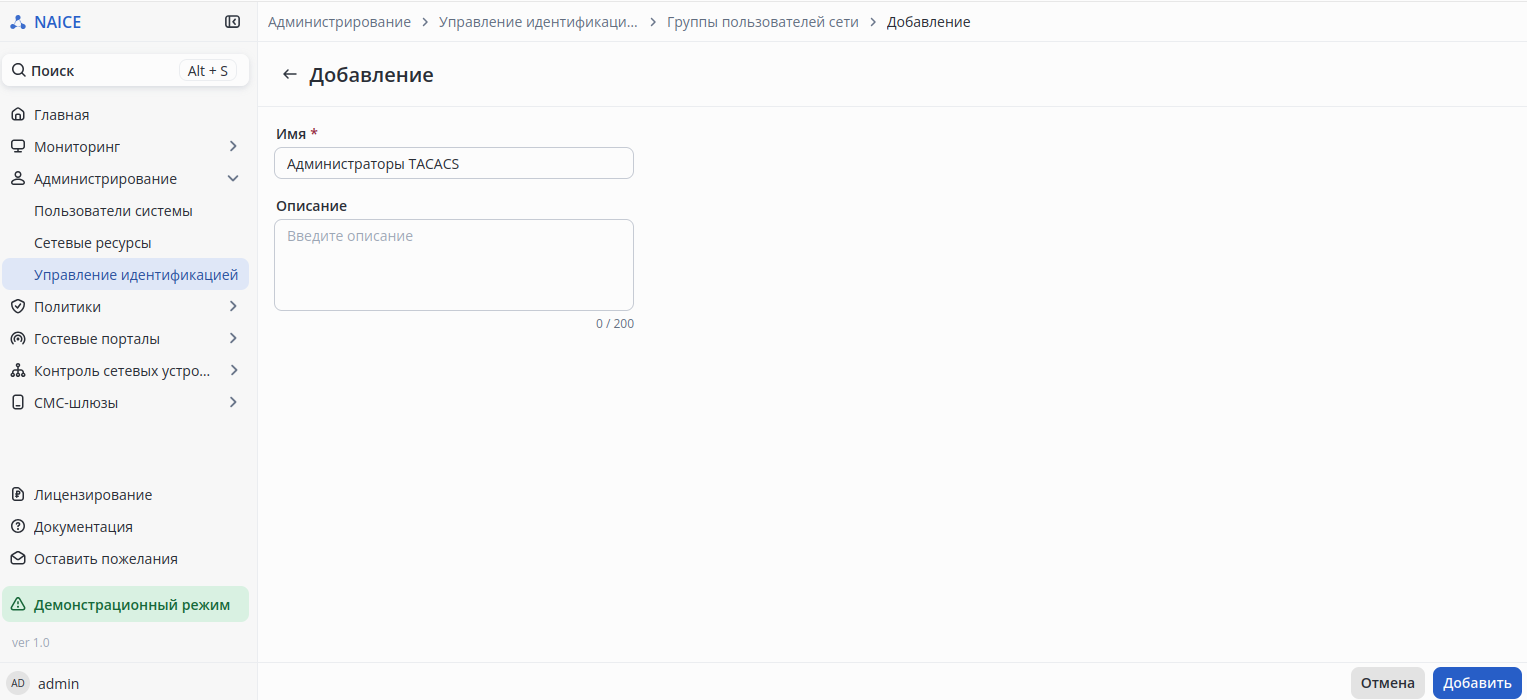 В открывшемся меню добавить группу с названием "Администраторы TACACS" и нажать кнопку "Добавить".