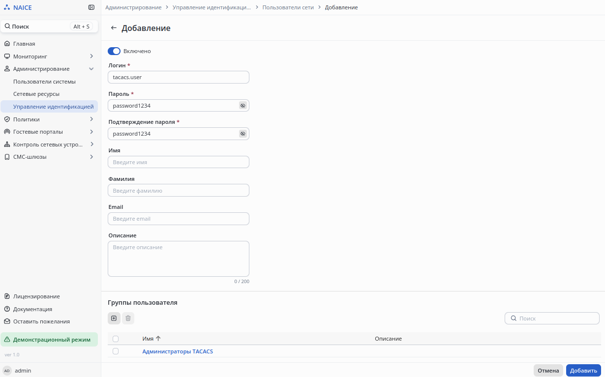 • tacacs.user находится в группе "Администраторы TACACS".