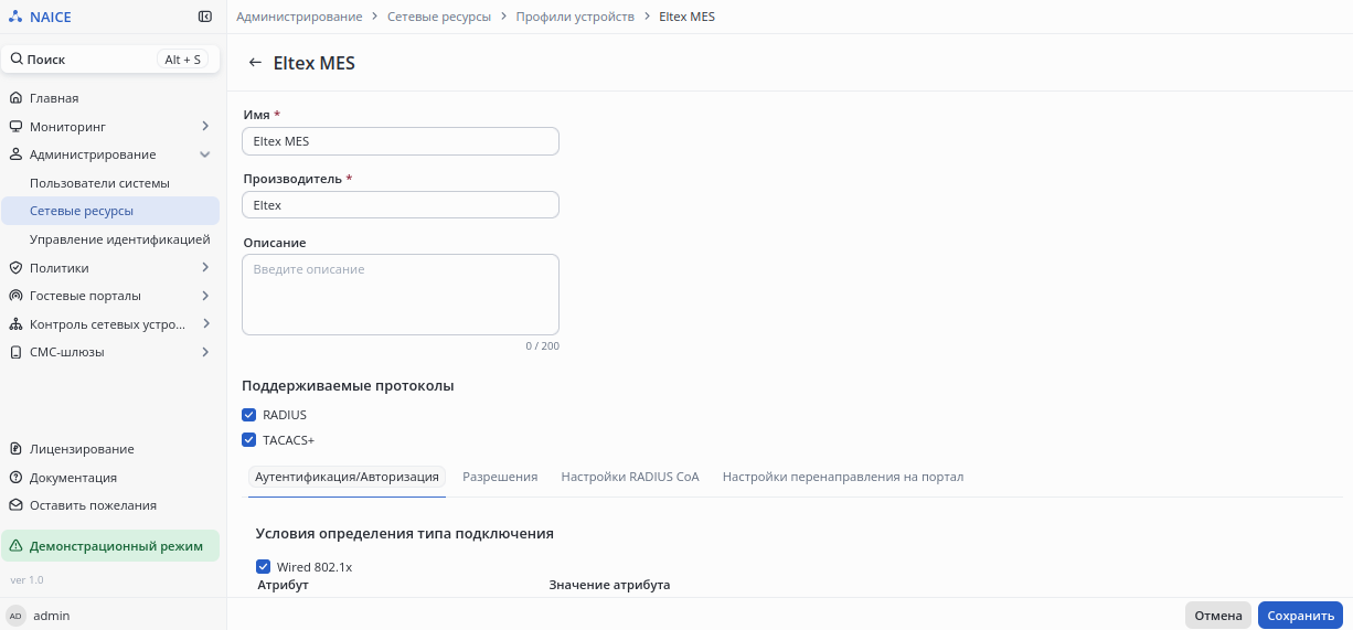 Перейти в раздел Администрирование → Сетевые ресурсы → Профили устройств. Создать или отредактировать существующий профиль устройства, включив в нем использование протокола TACACS+ в блоке "Поддерживаемые протоколы":