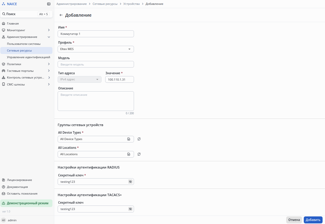 Перейти в раздел Администрирование → Сетевые ресурсы → Устройства. Создать или отредактировать существующее сетевое устройство, указав пароль TACACS+, который будет использоваться данным устройством: