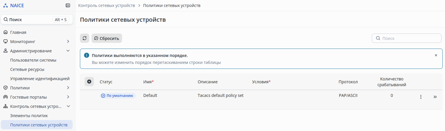 Перейти в раздел Контроль сетевых устройств → Политики сетевых устройств. После установки в наборе есть только одна политика по умолчанию Default. Её нельзя удалить и она всегда будет последней в списке политик.