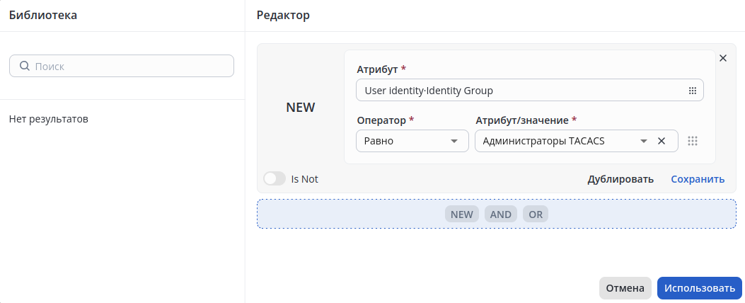 Задать условие: "User identity·Identity Group Равно Администраторы TACACS" и нажать "Использовать" внизу в правой части окна. После этого модальное окно закроется, а условие появится в колонке Условия*.