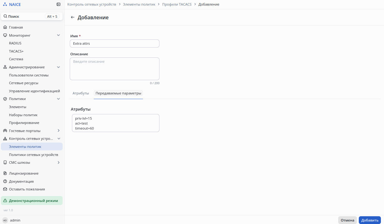 Открыть раздел Контроль сетевых устройств → Элементы политик → Профили TACACS. Создать профиль "Extra attrs":