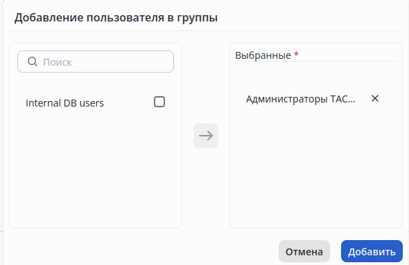 Чтобы добавить пользователя в ранее созданную группу "Администраторы TACACS", необходимо в блоке "Группы пользователя" нажать на и в открывшемся модельном окне выбрать группу и нажать , в результате чего группа переместится направо в "Выбранные*":