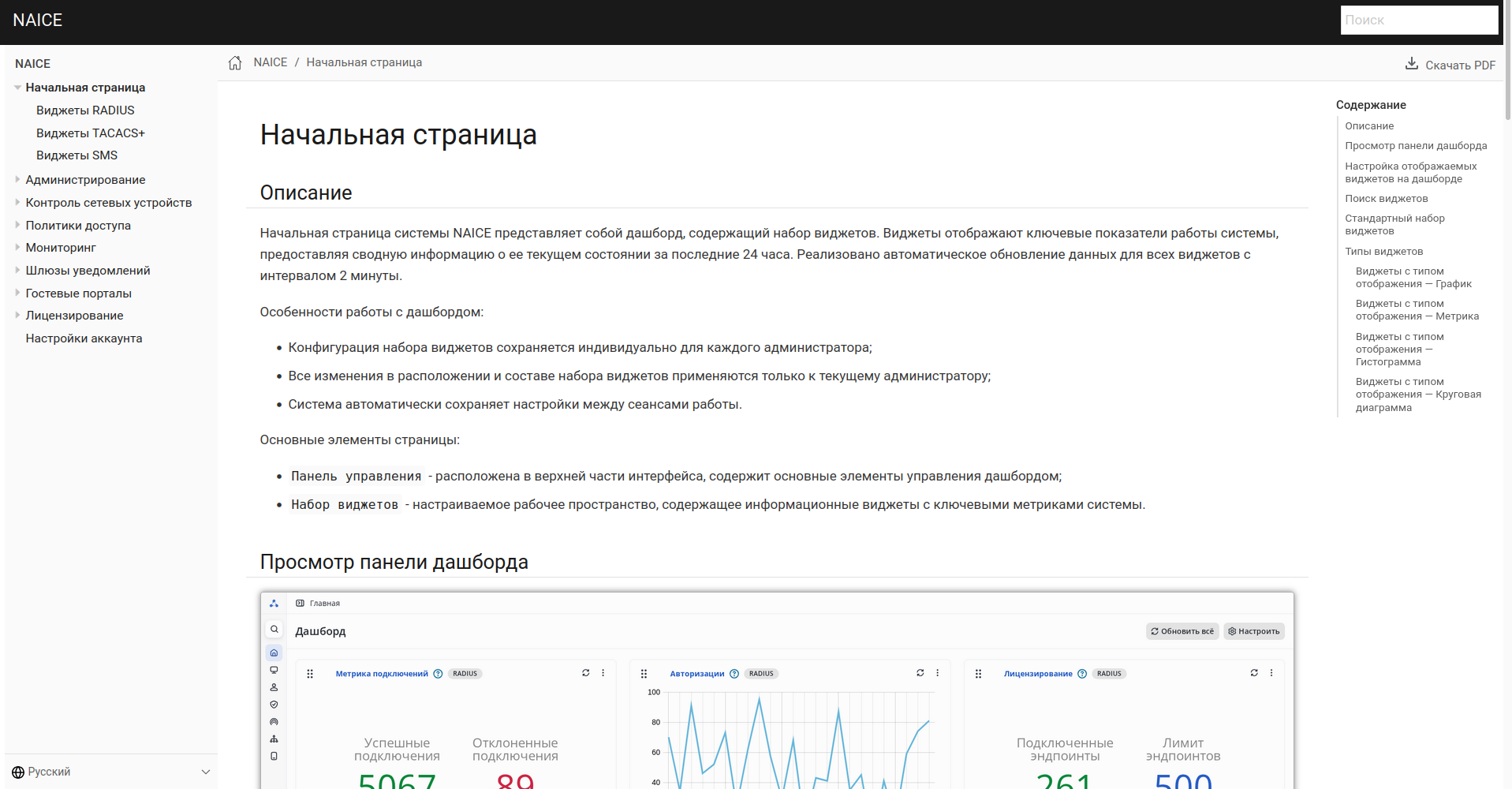 Для обеспечения постоянного доступа к документации предусмотрена возможность её выгрузки в формате PDF. Для этого следует нажать кнопку Скачать PDF в верхней правой части окна, после чего начнётся загрузка файла.