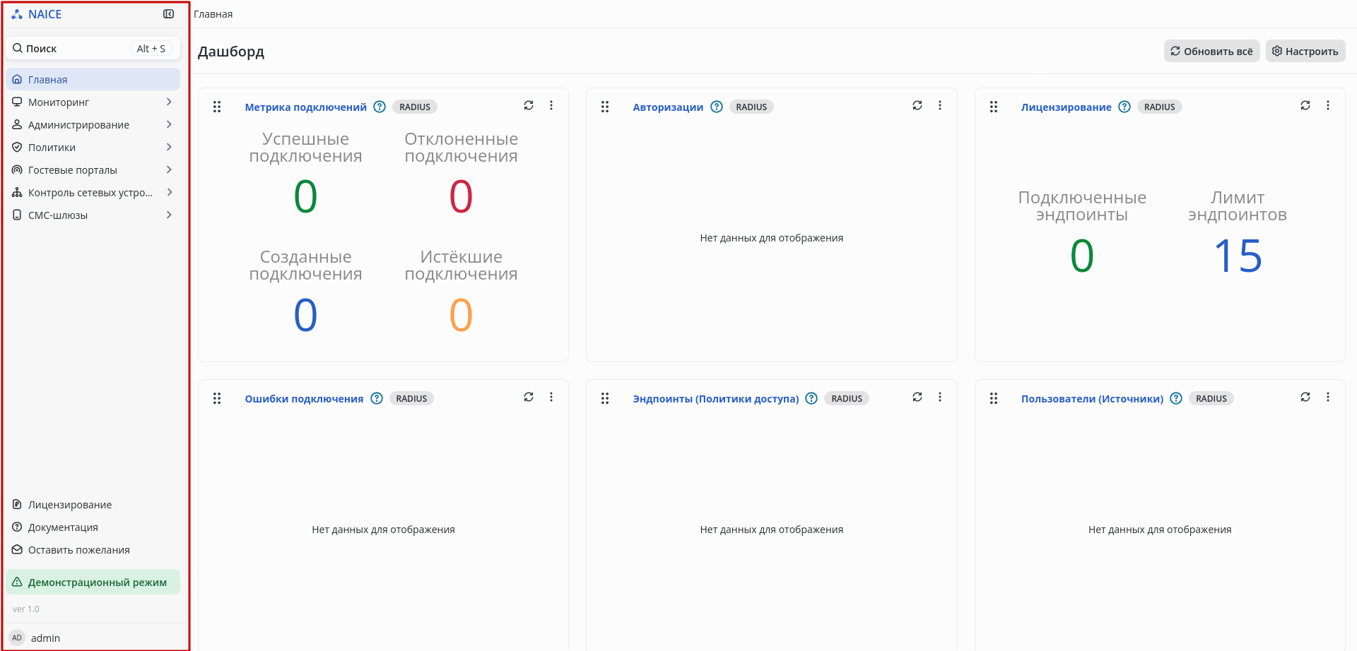 Доступность некоторых разделов зависит от уровня активированной в NAICE лицензии, приобретенных дополнительных опций в ней, а также от роли текущего администратора.