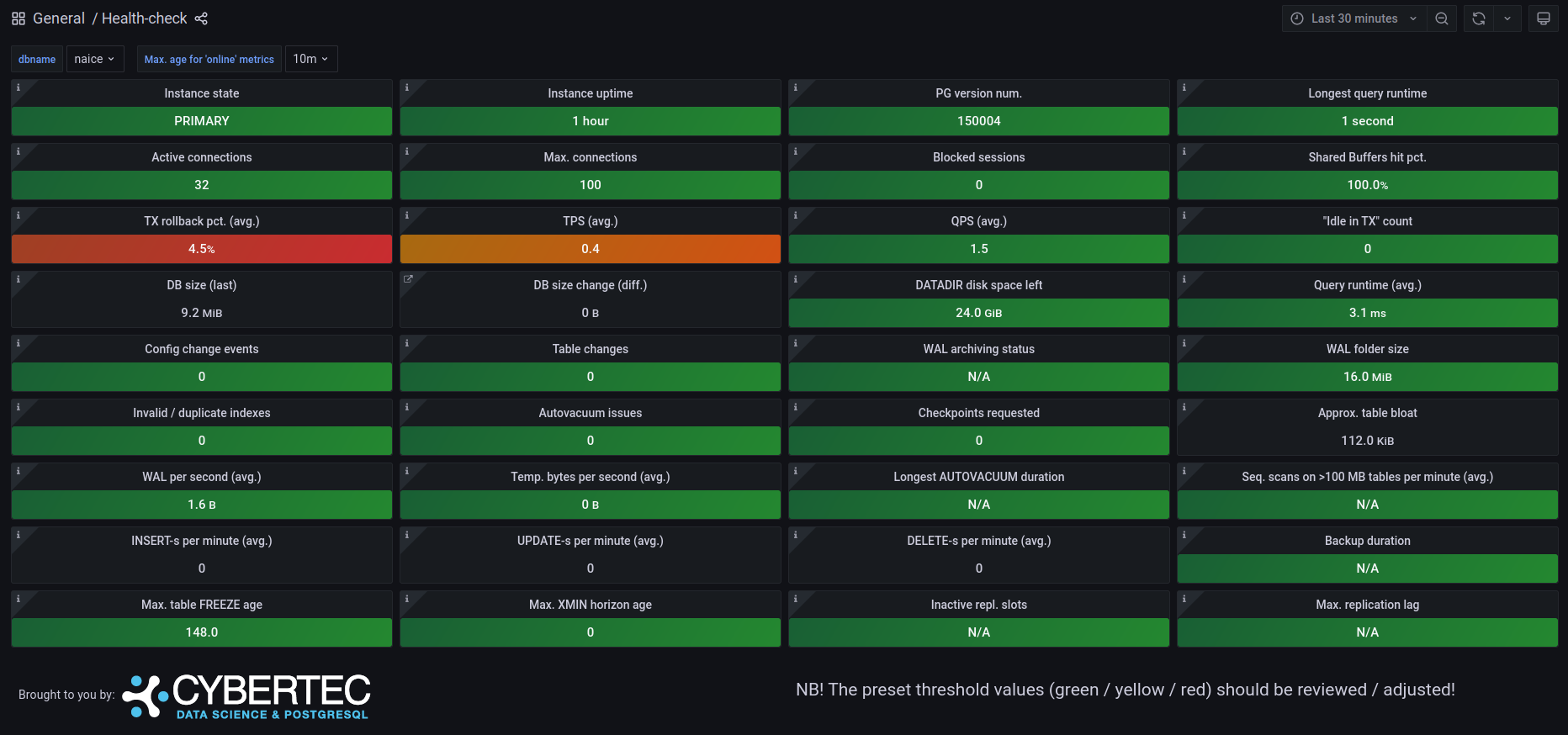 | Tuples fetched vs returned | Процент строк, затронутых запросами, которые фактически возвращаются клиенту. Низкие значения (<10%) для рабочей нагрузки OLTP могут указывать на отсутствующие индексы. |