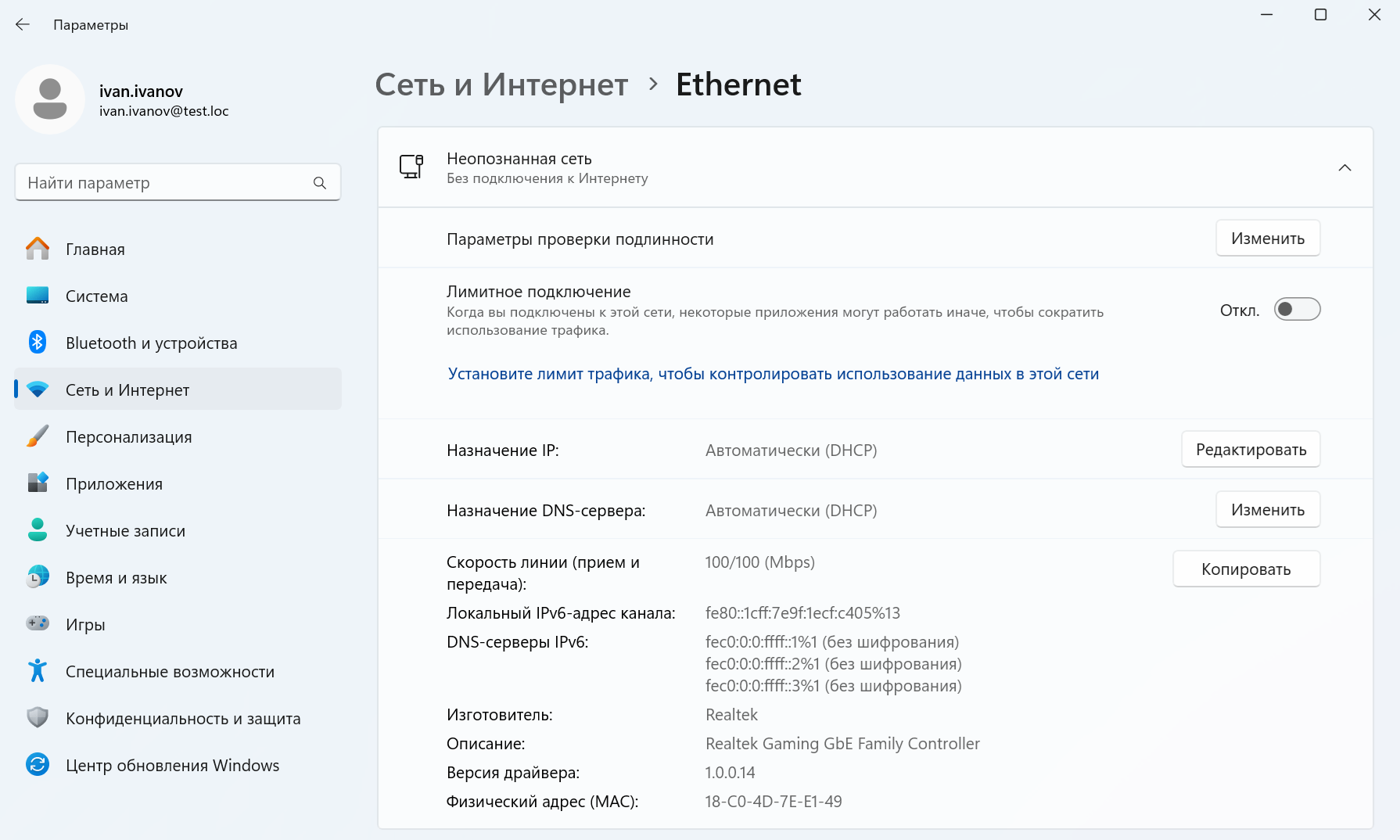 Развернуть раздел Ethernet:
