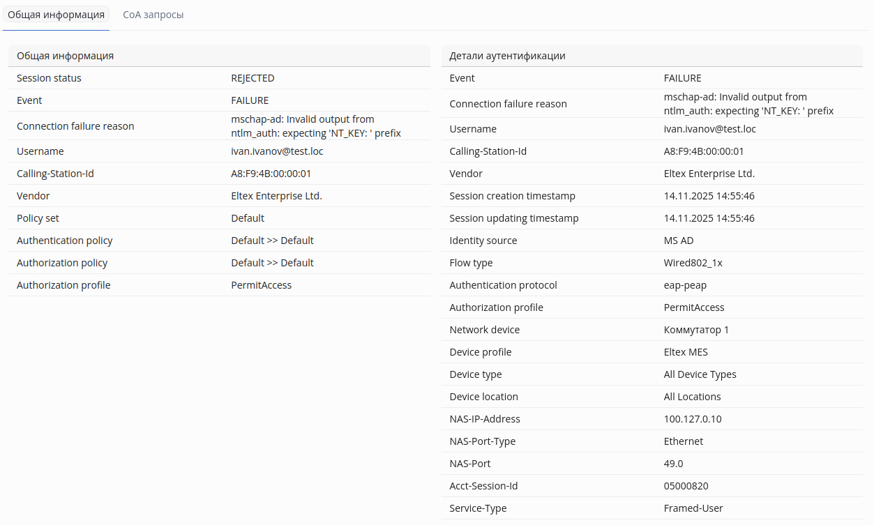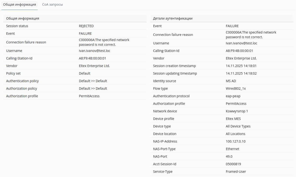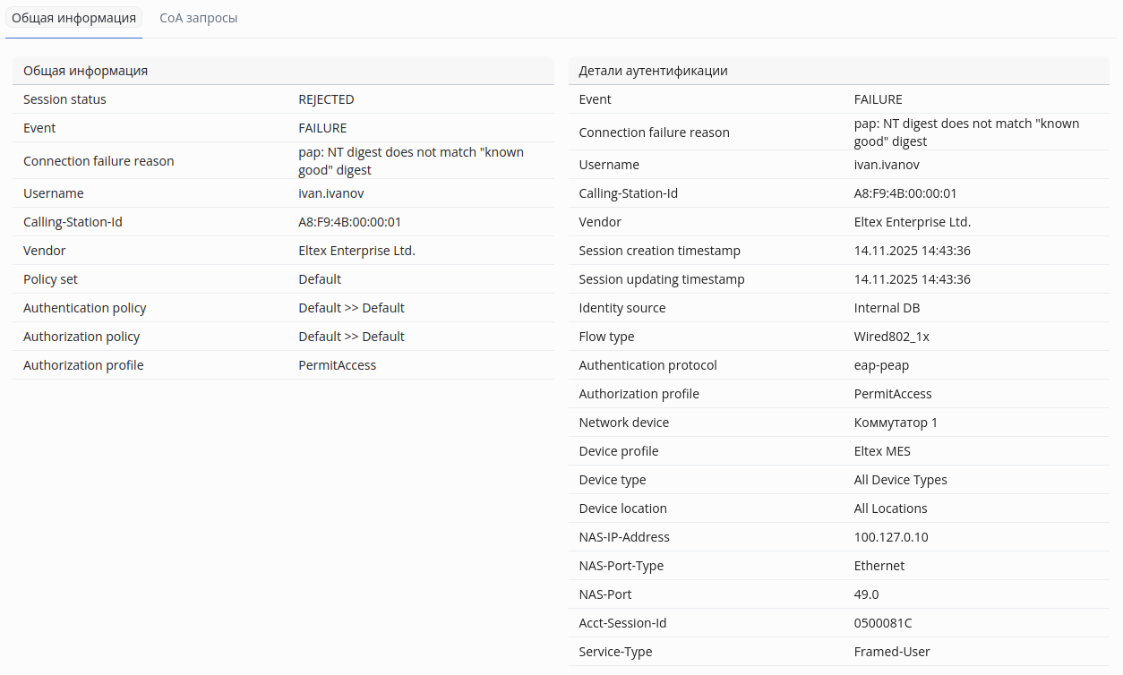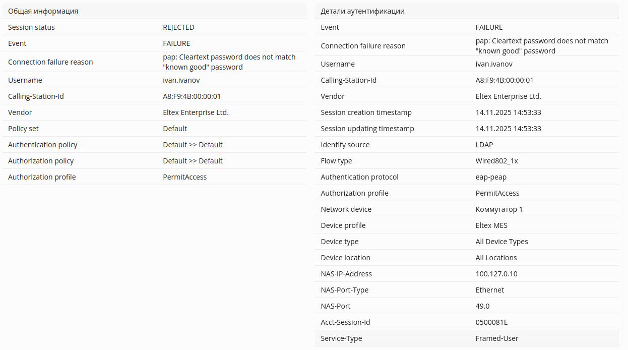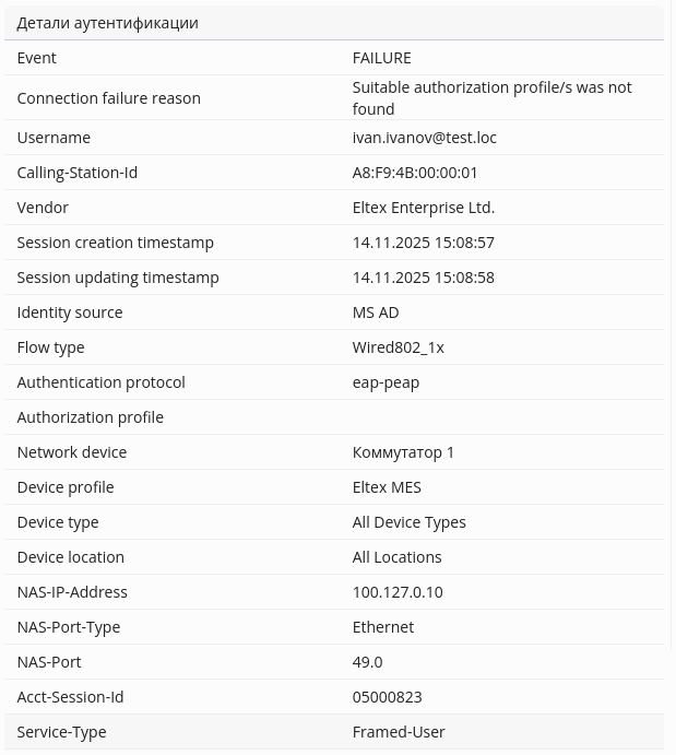 Ошибка Failure как правило возникает при отказе в авторизации согласно профилю авторизации DenyAccess. При этом логин пользователя найден в источнике идентификаций и отображается разделе Мониторинг → RADIUS → Пользовательские сессии: