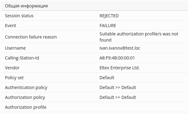 Policy set- соответствует ли определенная политика требуемой. Если нет - перейти в раздел Политики → Наборы политик и проверить корректность настройки условия политики, под которое как ожидается должны попадать RADIUS запросы от сетевого устройства при аутентификации пользователя.Authentication policy- проконтролировать, соответствует ли определенная политика требуемой.Authorization policy- проверить, соответствует ли ли определенная политика требуемой. Если нет - перейти в раздел Политики → Наборы политик, провалится в политику определенную вPolicy setи проверить корректность настройки условия политики авторизации, под которое как ожидается должны попадать RADIUS запросы от сетевого устройства при авторизации пользователя.Authorization profile- проверить, соответствует ли определенный профиль ожидаемому и при необходимости исправить.В приведенном выше примере определен профиль авторизации DenyAccess. В рамках одной политики авторизации можно указать несколько профилей авторизации. Но если среди них используется профиль авторизации по умолчанию DenyAccess - он имеет безусловный приоритет над всеми остальными профилями, что привете к запрету авторизации в данной политике авторизации.