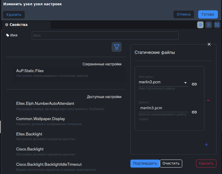 - В параметре AuP.Static.Files выберите необходимый файл, задайте для него шаблон и нажмите «Подтвердить»: