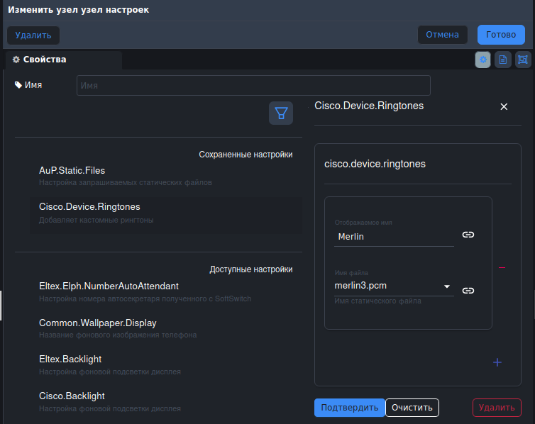 - В параметре Cisco.Device.Ringtones укажите имя шаблона, которое указывалось на предыдущем шаге, а также имя, которое будет отображаться в списке рингтонов на устройстве, после чего нажмите «Подтвердить»: