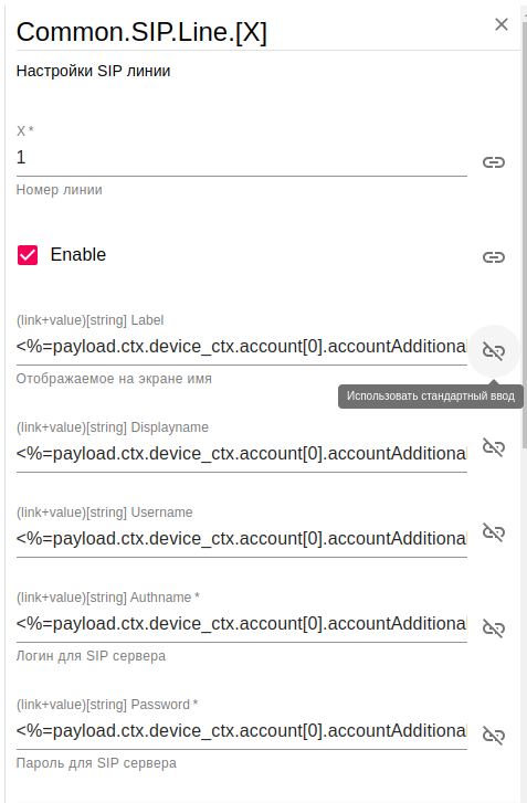 Для примера настроим абонентскую SIP-линию, для этого в узле настроек необходимо добавить и заполнить параметр Common.SIP.Line.[X] переменными из контекстов: