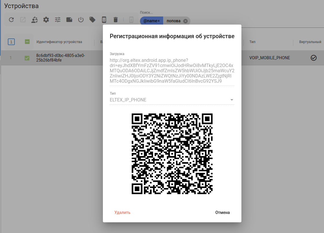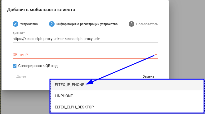 - DRI тип — ELTEX_IP_PHONE для клиентов Elph Android и Elph iOS, ELTEX_ELPH_DESKTOP для клиентов Elph Desktop;