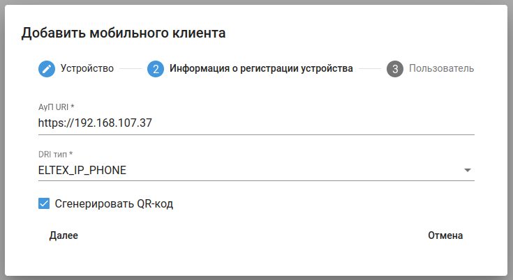 4. Заполните поля в диалоговом окне во втором пункте «Информация о регистрации устройства»: «АуП URI» — https://192.168.107.37 (адрес ECSS Elph Proxy!), «DRI тип» — ELTEX_IP_PHONE (Рисунок 3).