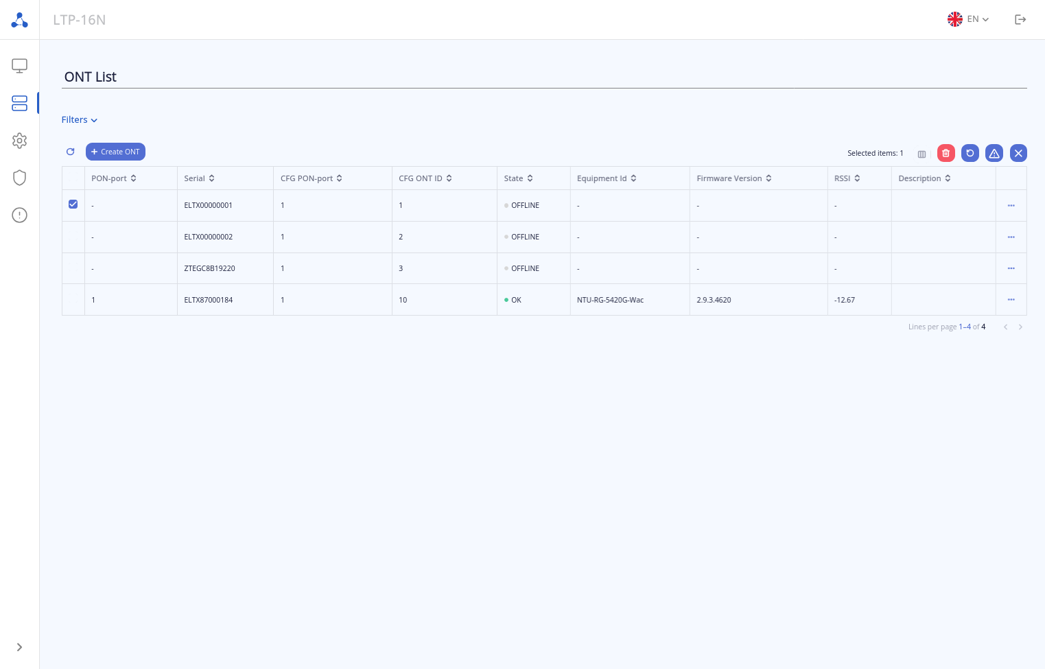 In the table opposite each ONT, an additional context menu of actions with the selected ONTs is available – . By clicking this button, the following actions are available: