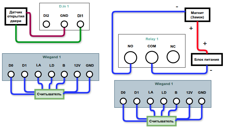 Для примера подключим одну дверь с датчиком открытия двери, одним считывателем пропусков и кнопкой открытия двери.