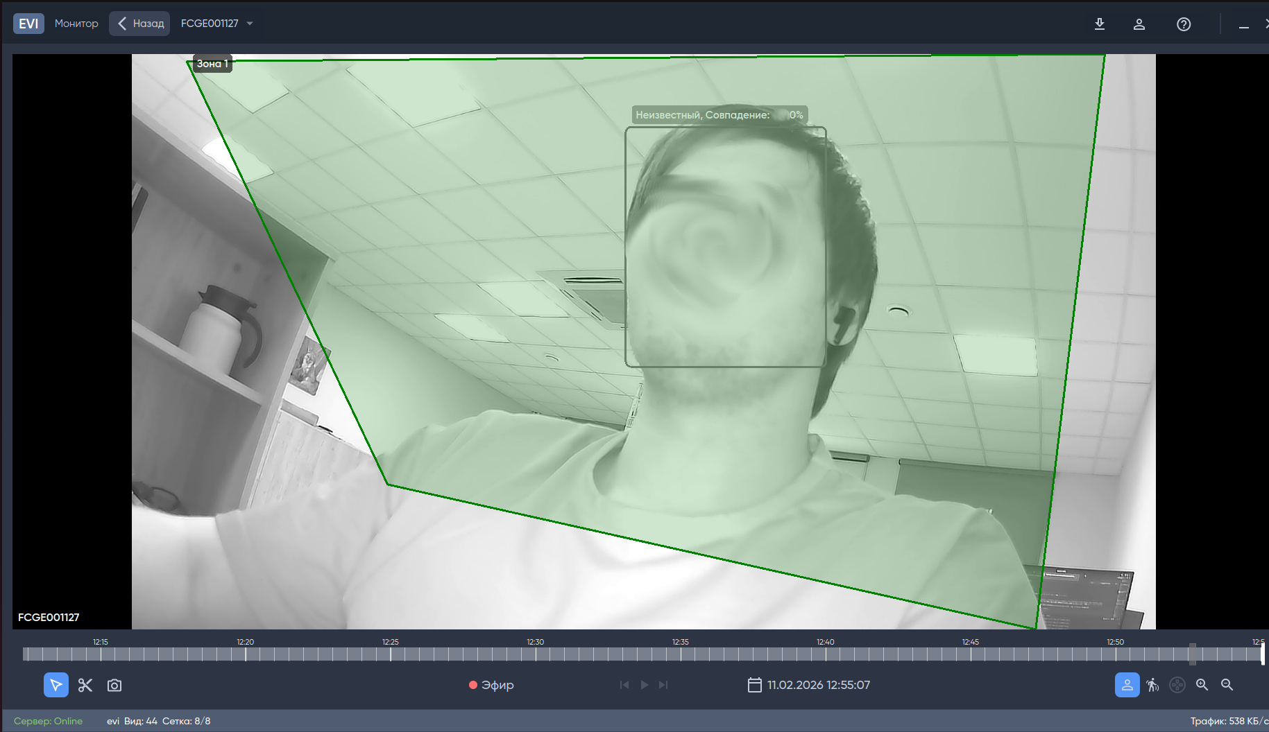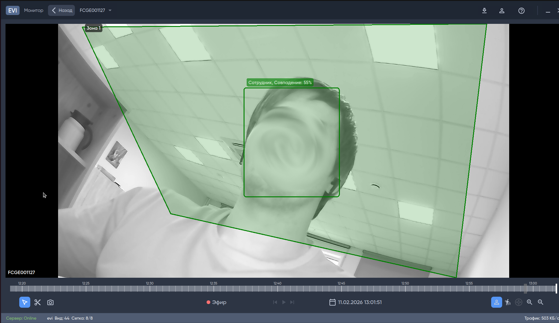 Отображение работы аналитики в эфире камеры при включенной аналитике по лицу сотрудника.
