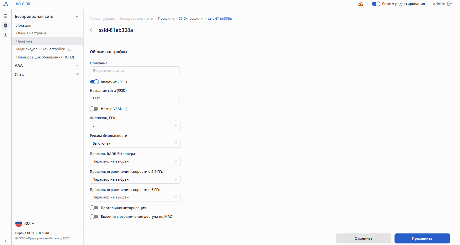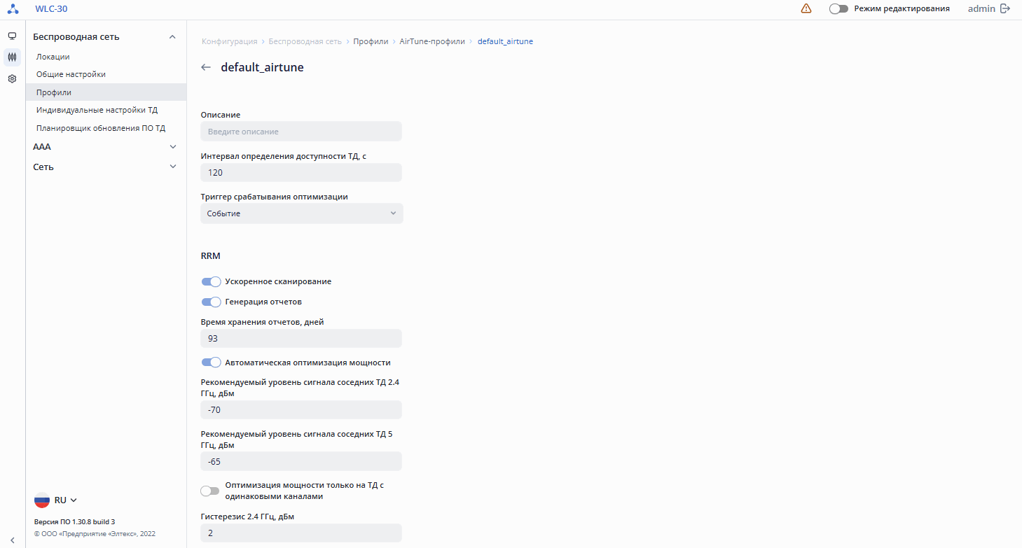 - Настроить – создание индивидуального профиля настроек точки доступа, в котором присутствует возможность задать имя ТД, переопределить локацию или профиль общих настроек ТД, переопределить параметры радиопрофилей, такие как режим работы радиоинтерфейса, канал, ширина канала, мощность, а также отключить использование AirTune. Действие доступно при включенном режиме редактирования.
