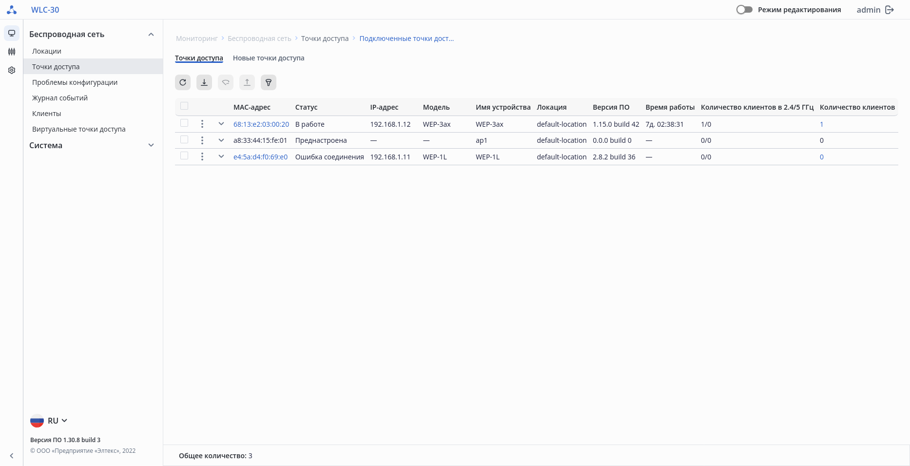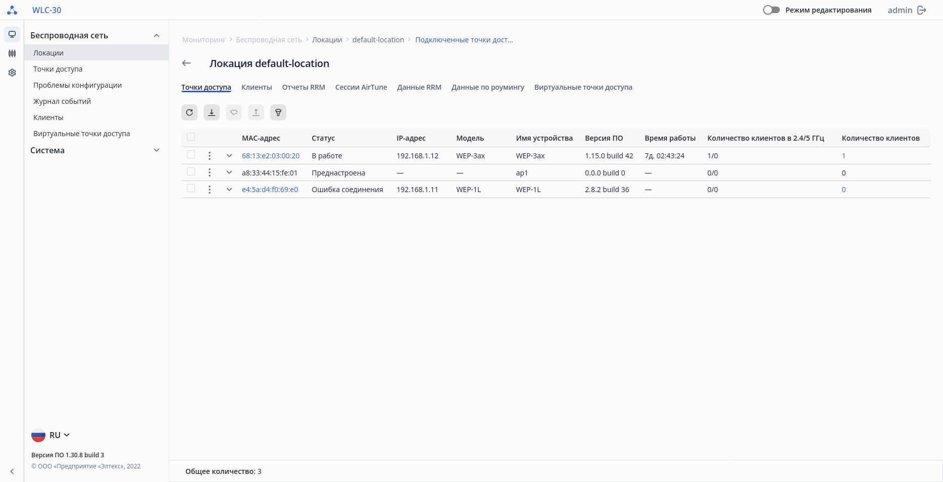 На странице отображены точки доступа, которые зарегистрированы и находятся в выбранной локации, а также точки доступа, которые преднастроены в конфигурации, но еще не подключены к контроллеру. Параметр «Общее количество» показывает число зарегистрированных точек доступа и настроенных через индивидуальные настройки по MAC-адресу в выбранной локации.