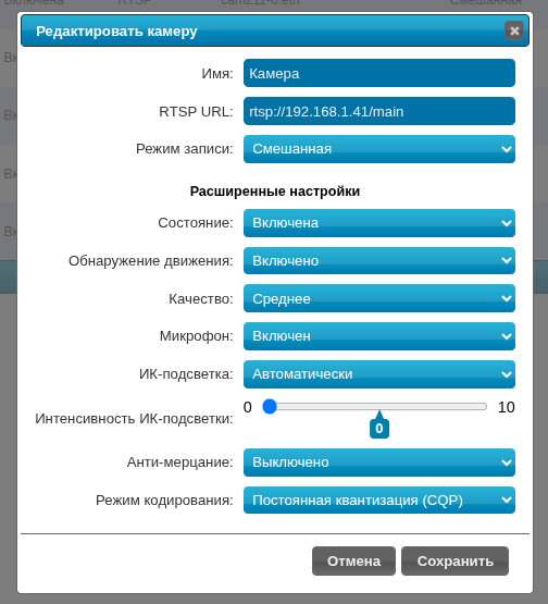 При нажатии на кнопку появляется возможность отредактировать настройки камеры.