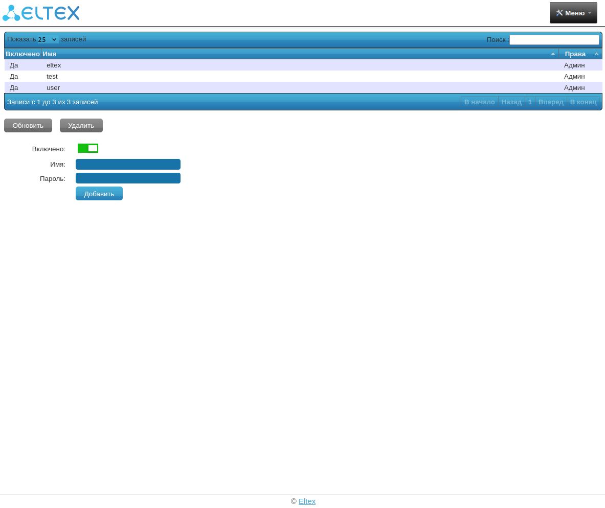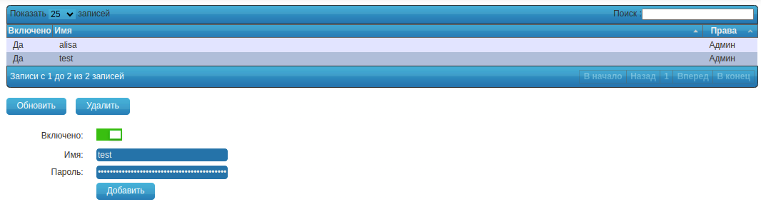 На данной странице представлены функции управления пользователями: добавление пользователя, изменение имени и пароля, удаление пользователя, включение/отключение пользователя.