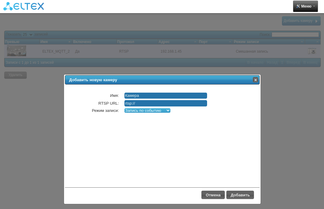 В левом верхнем углу нажмите кнопку Добавить камеру, укажите название и ссылку на RTSP-поток.
