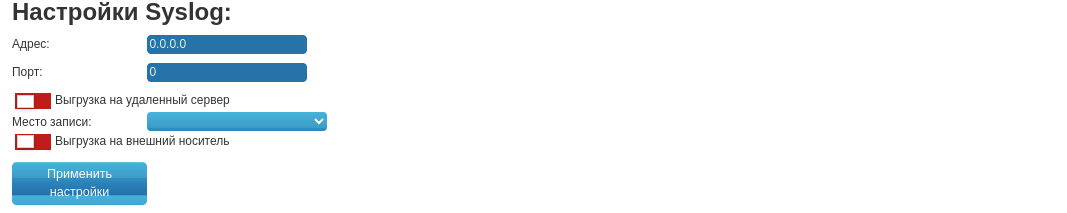 • Включать/отключать логирование на удаленный syslog-сервер с указанием адреса и порта сервера;