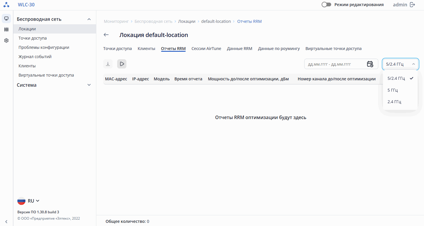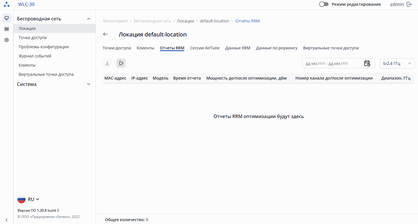 При переходе в локацию будут доступны списки точек доступа и клиентов, отчеты RRM, сессии точек доступа c сервисом AirTune, данные RRM, данные по роумингу и активные виртуальные точки доступа.