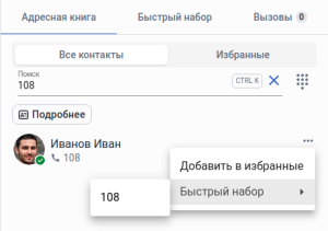 При наведении курсора мыши на выбранный контакт появляется возможность начать чат либо позвонить . При нажатии на значок меню в выпадающем меню доступен пункт Добавить в избранные (Удалить из избранных, если контакт был добавлен ранее), а также Быстрый набор, позволяющий добавить номер пользователя к списку номеров для быстрого набора, либо удалить, если был добавлен ранее.