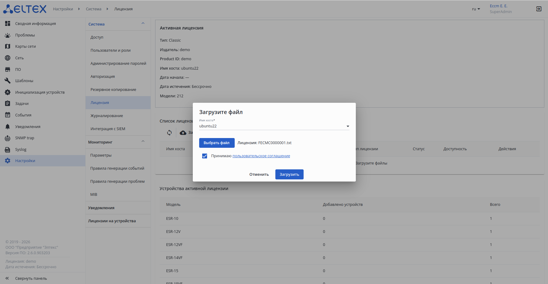 Для инсталляции ключа лицензии перейдите в раздел "Настройки" → "Система" → "Лицензия" и в блоке "Список лицензий" нажмите кнопку "Загрузить". Откроется диалоговое окно мастера активации лицензии.
