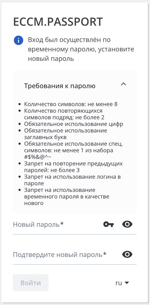 Введите логин eccm и временный пароль eccm в соответствующие поля и нажмите кнопку "Войти".