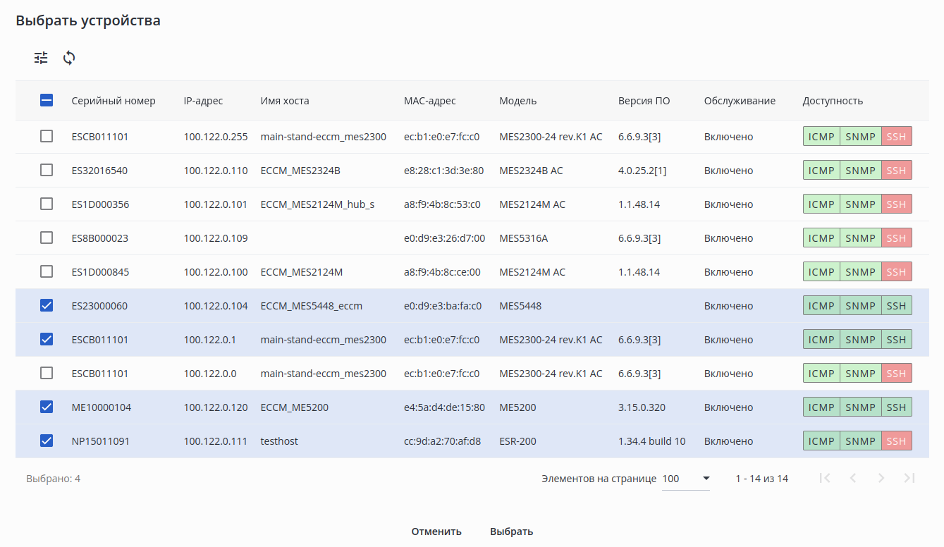 • Обслуживание — статус обслуживания устройства в системе. Если в колонке отображается статус "Включено", то устройство полностью обслуживается системой (опрос доступности, метрики, резервное копирование конфигурации, управление). В других случаях функции обслуживания могут быть приостановлены;