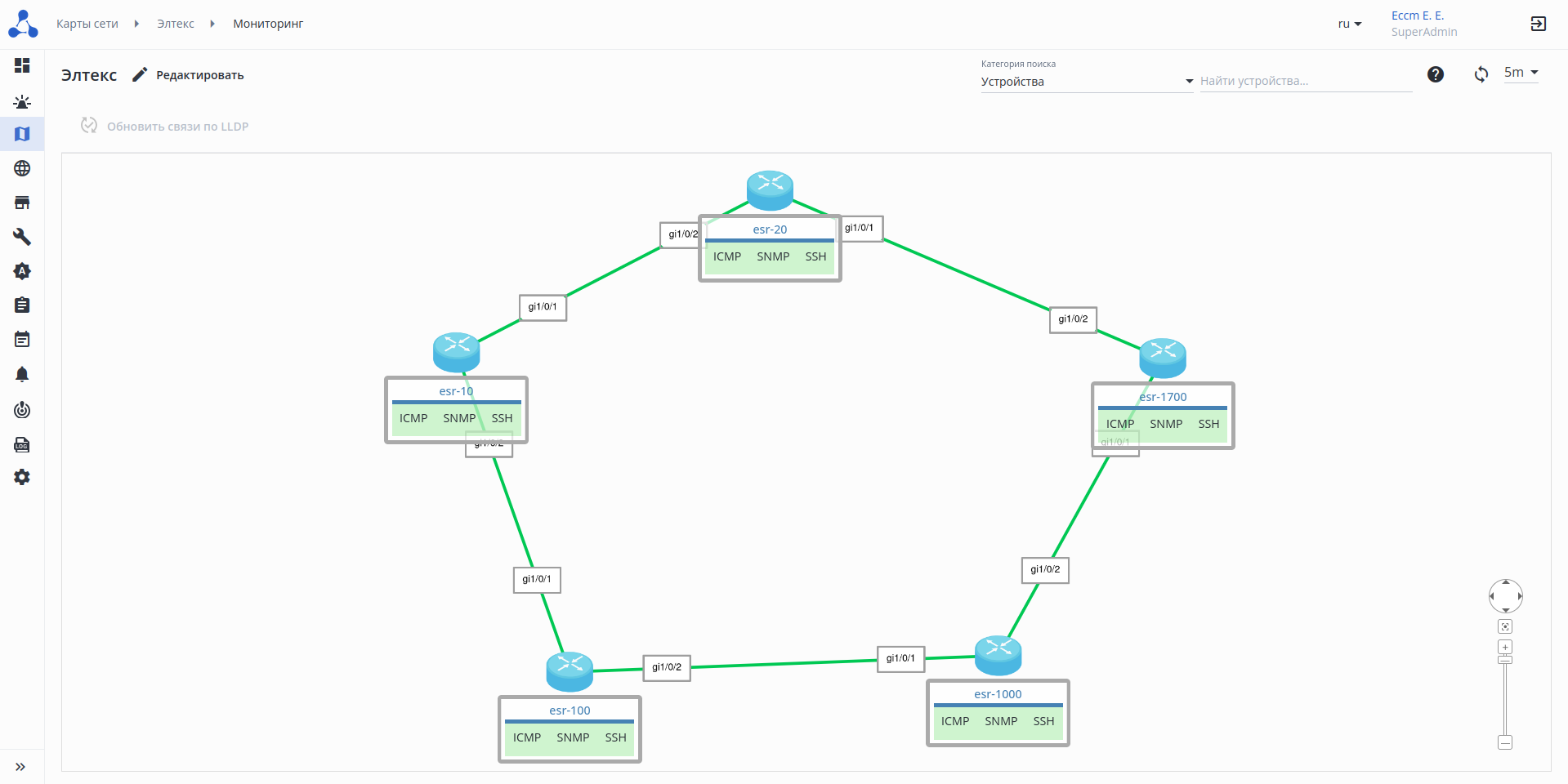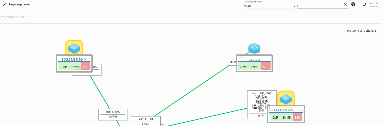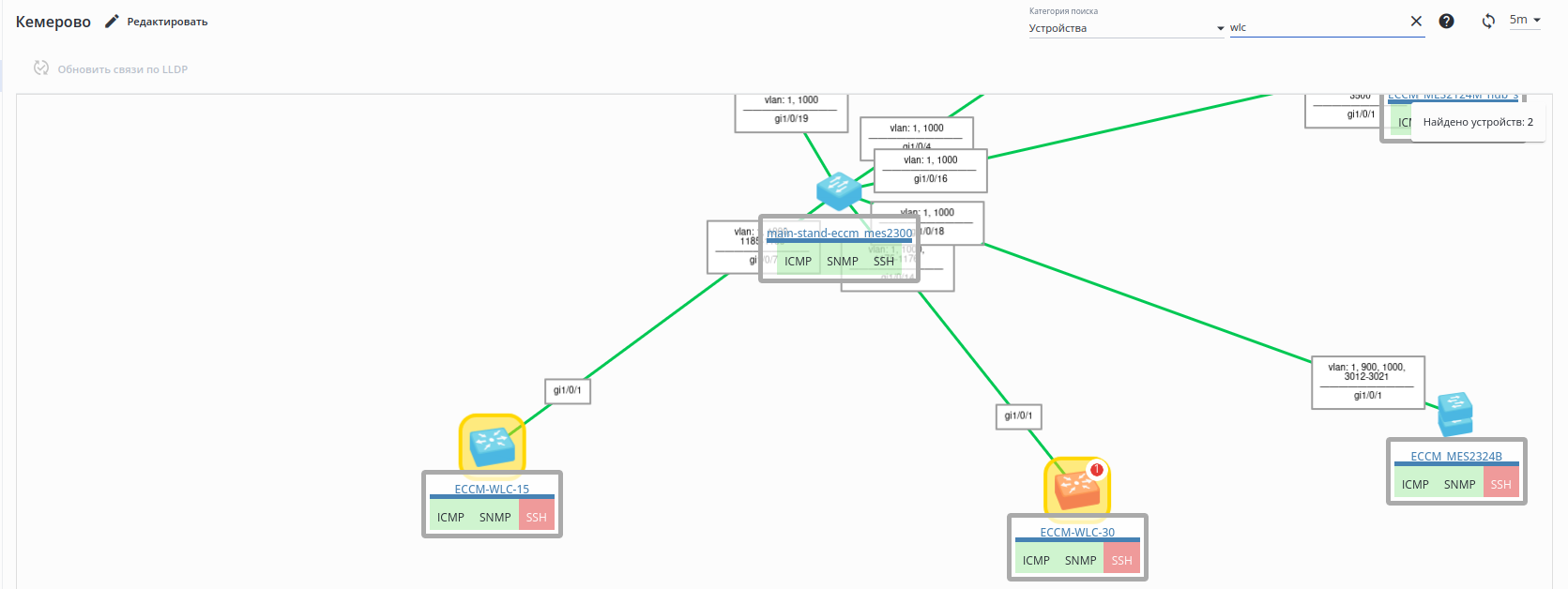 1. Кнопка "Обновить связи по LLDP" — создает групповую задачу для опроса выбранных устройств по LLDP, после чего на карте будут отображены новые связи (удаление старых связей в автоматическом варианте запрещено);