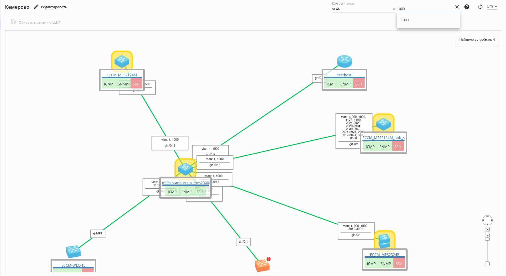 На странице карты доступен полнотекстовый поиск. Поиск осуществляется по нескольким категориям: "Устройства" и "VLAN" (поиск возможен по имени и номеру VLAN). Для поиска устройств введите шаблон для поиска в поле ввода в верхнем правом углу страницы и нажмите ENTER. Если будет найдено совпадение по шаблону, будет отображен счётчик найденных устройств, а устройство — выделено желтым цветом: