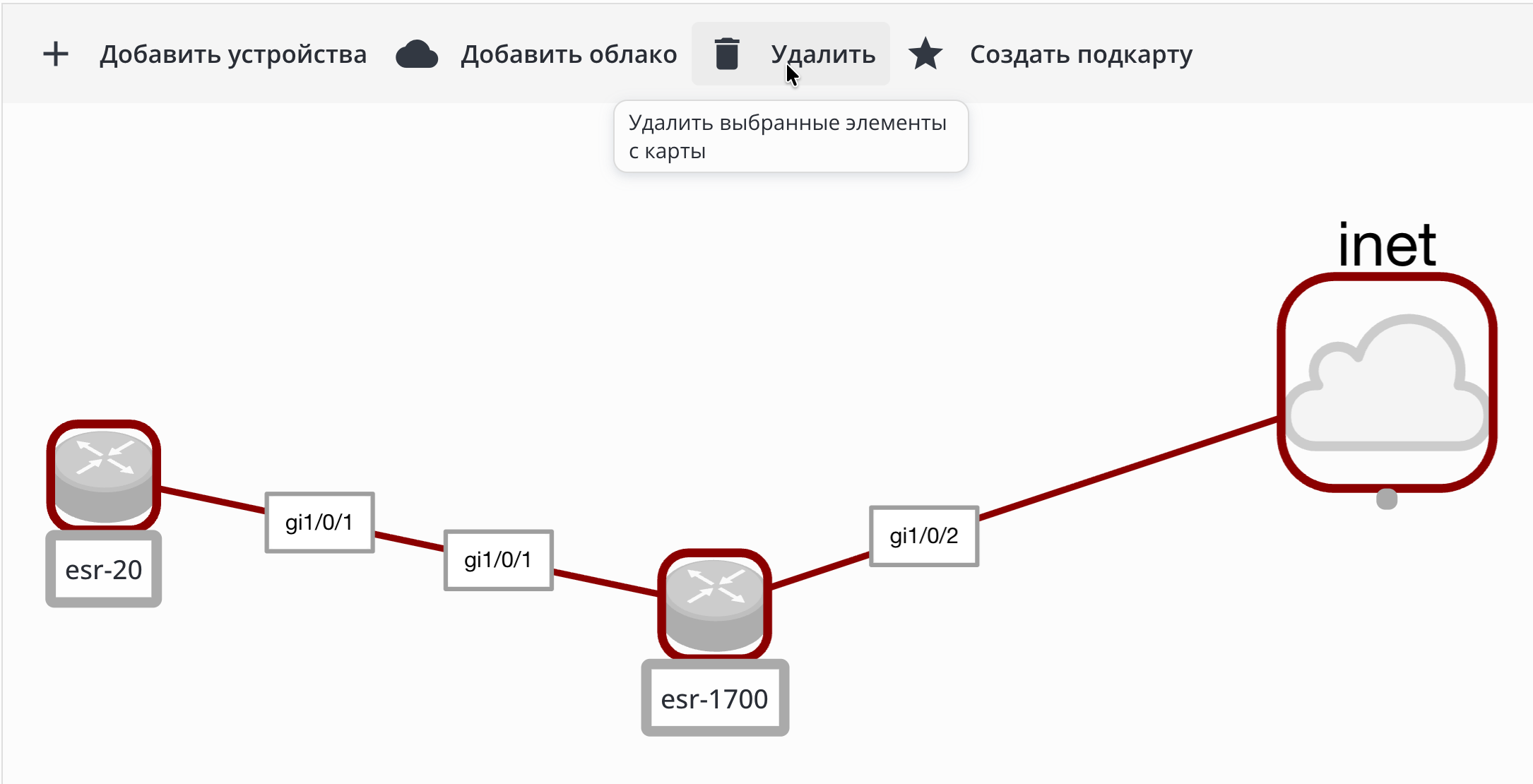 Для удаления элементов (узлы, связи, подкарты и др.) в редакторе карт выберите их и нажмите кнопку "Удалить":