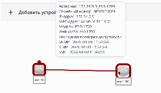 При наведении мыши на иконку устройства будет показана подробная информация о данном устройстве: название, серийный номер, IP-адрес, MAC-адрес, модель, имя хоста и время последней проверки доступности по протоколам ICMP, SNMP и SSH.