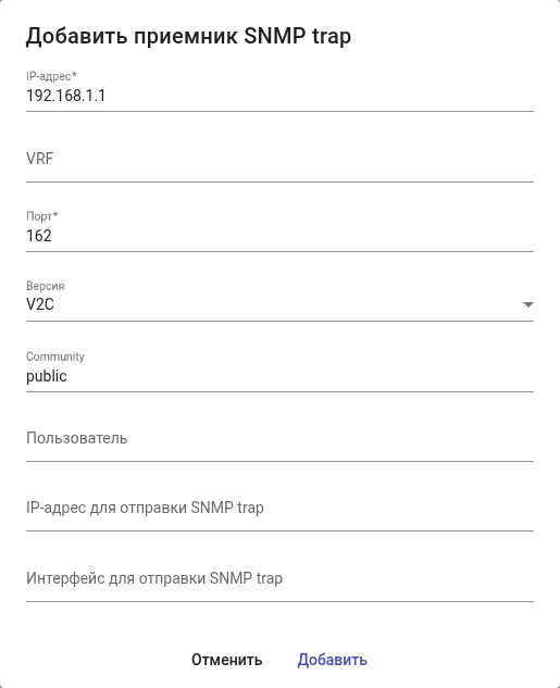 Для добавления нового приёмника SNMP trap нажмите на кнопку "Добавить". Откроется диалоговое окно:
