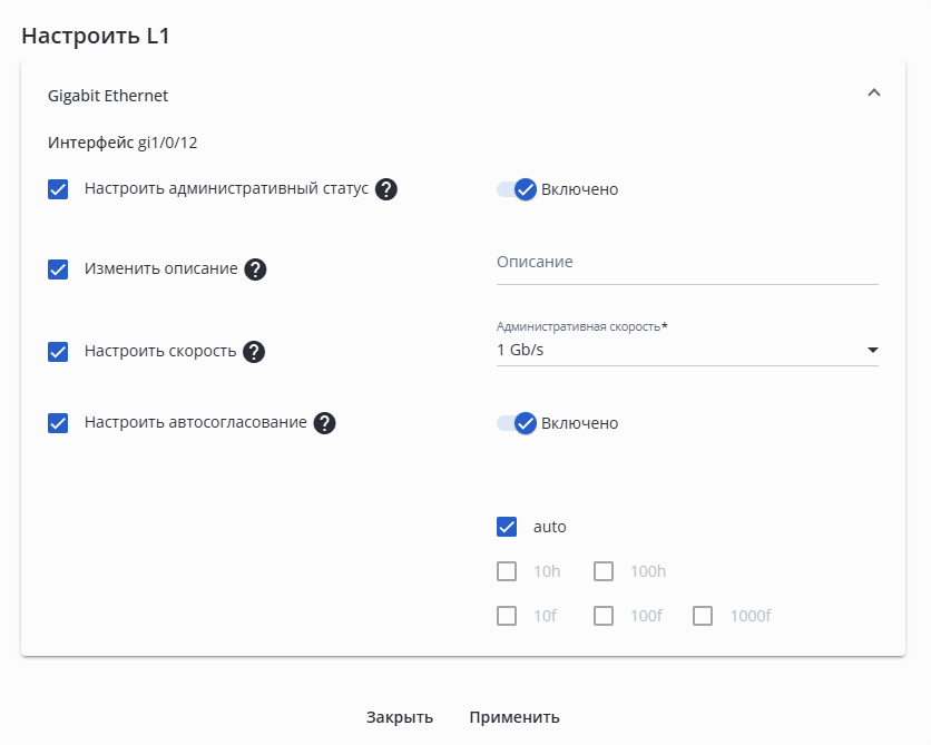 Для изменения административного статуса, скорости, описания, автосогласования и режима согласования с помощью флагов выберите в таблице интерфейс и нажмите кнопку "Настроить L1". Откроется диалоговое окно "Настроить L1":