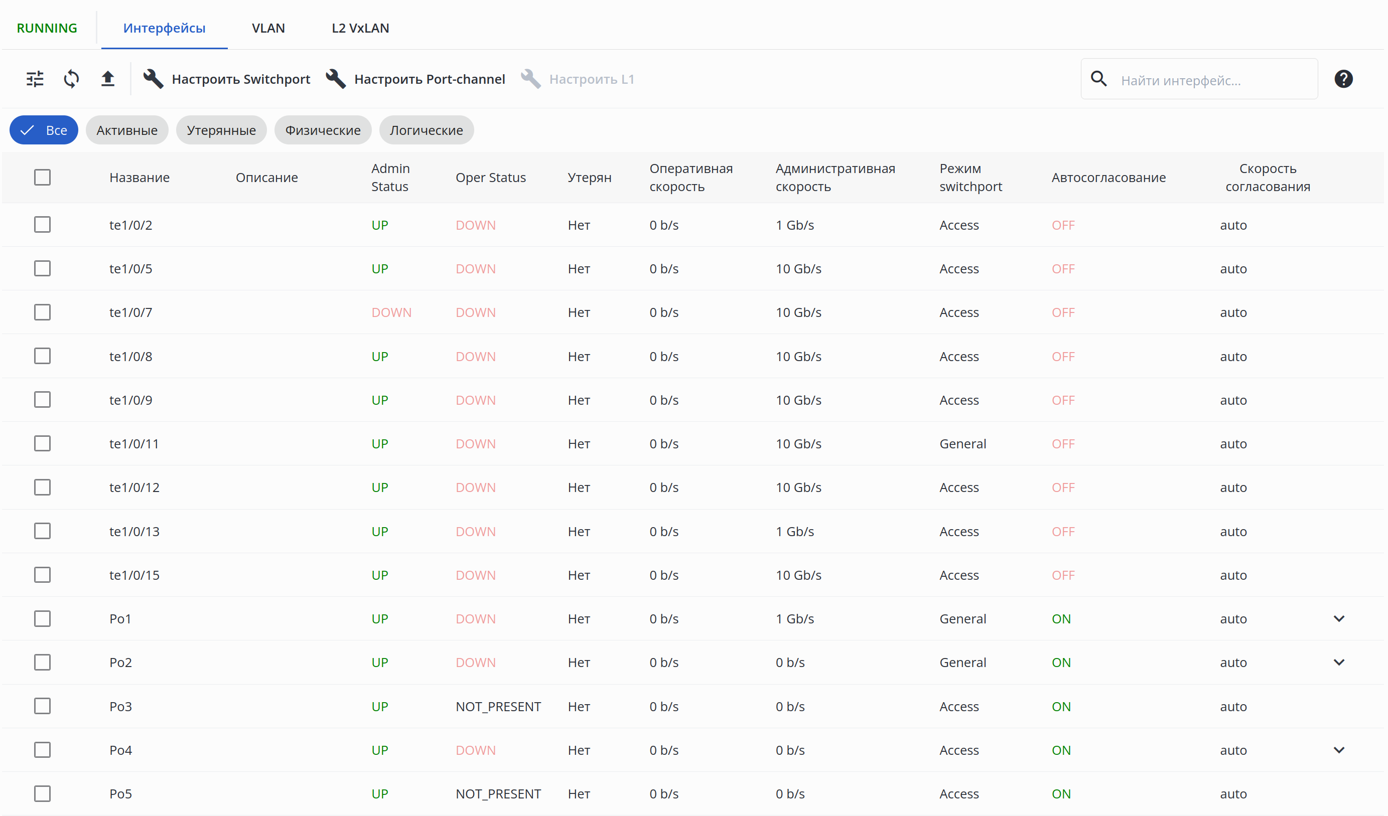 12. Иконка раскрытия подтаблицы —  отображается только для логических интерфейсов типа port-channel при условии наличия добавленных в них физических интерфейсов.