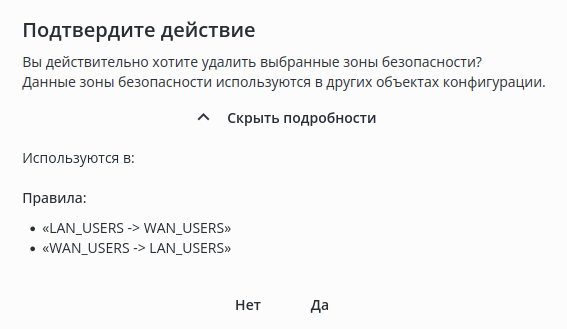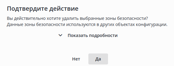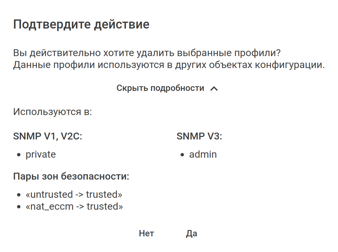 При нажатии на кнопку "Показать подробности" откроется список объектов конфигурации, в которых используются удаляемые профили доступа: