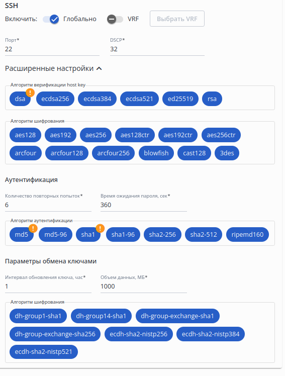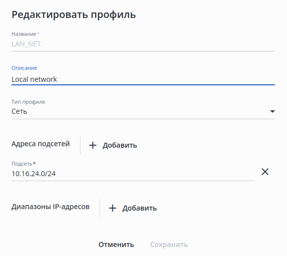 • Описание — описание интерфейса. Настройка доступна при включенном флаге "Изменить описание". Может содержать латинские буквы (aA-zZ), цифры и символы '_', '-', ',', '.'. Значение по умолчанию: