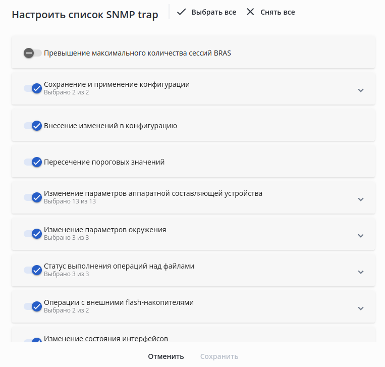 • рядом с названием раздела указывается, сколько SNMP trap было выбрано для включения ("Выбрано 2 из 2").