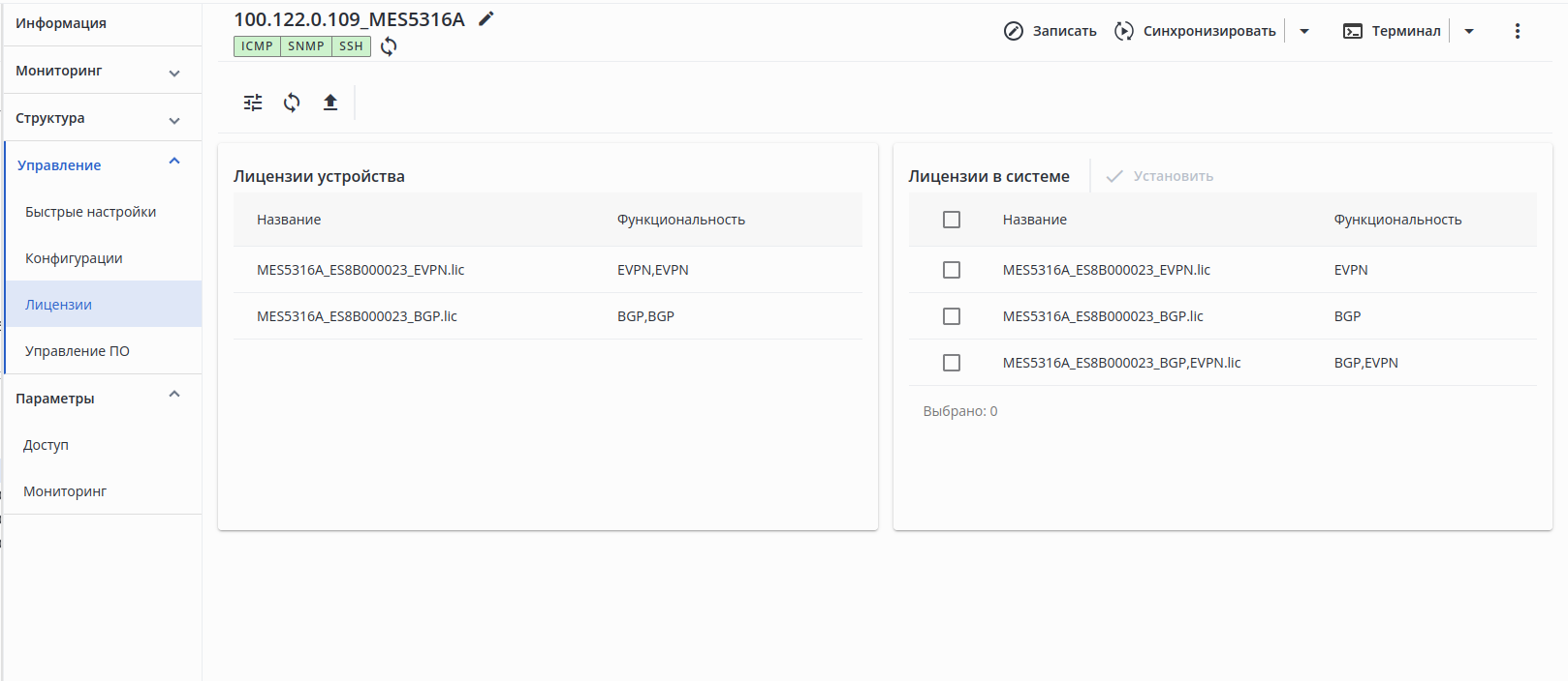 Для установки лицензии на устройство выберите файл лицензии с помощью флагов и нажмите кнопку "Установить". Будет создана задача на установку лицензии на устройство. В процессе установки устройство будет перезагружено. По завершении установки лицензия будет доступна в таблице "Лицензии устройства".
