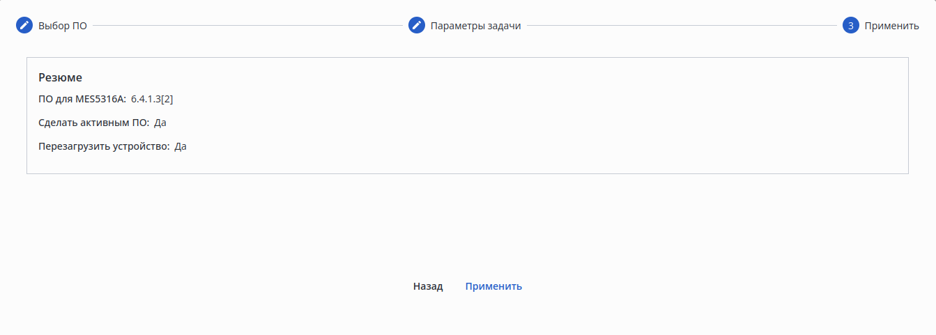 Проверьте правильность параметров. Если необходимо внести изменения, нажмите кнопку "Назад" и вернитесь к шагу, параметры которого необходимо скорректировать. Если все параметры были указаны верно, нажмите кнопку "Применить". Будет создана задача на обновление ПО устройства, выполнение которой начнется в ближайшее время.