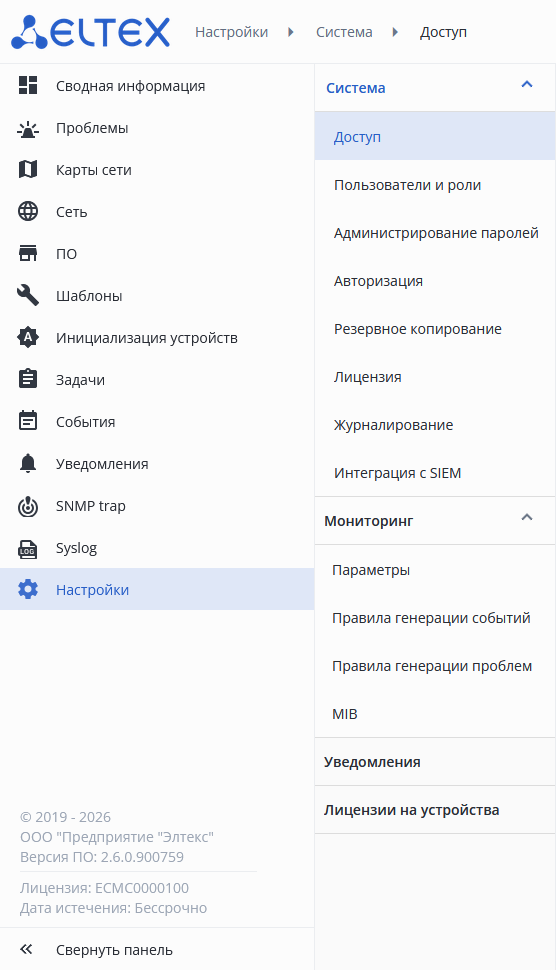 Раздел общих настроек системы включает подразделы со вкладками: